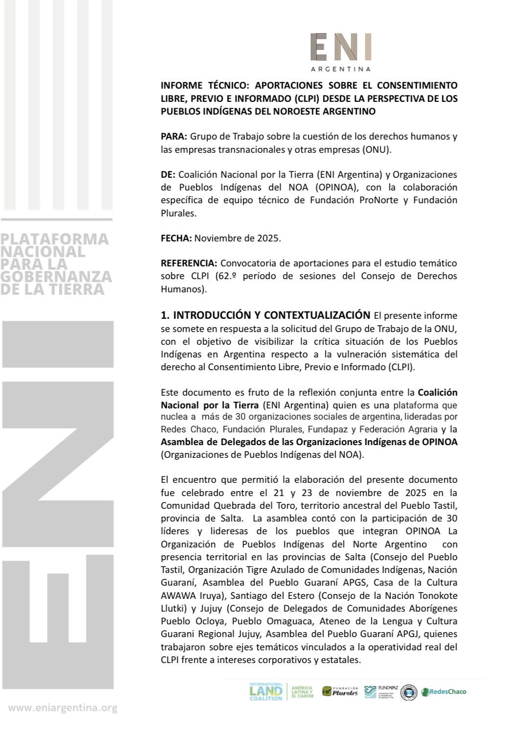 El presente informe se somete en respuesta a la solicitud del Grupo de Trabajo de la ONU, con el objetivo de visibilizar la crítica situación de los Pueblos Indígenas en Argentina respecto a la vulneración sistemática del derecho al Consentimiento Libre, Previo e Informado (CLPI). Este documento es fruto de la reflexión conjunta entre la Coalición Nacional por la Tierra (ENI Argentina) quien es una plataforma que nuclea a más de 30 organizaciones sociales de argentina, lideradas por Redes Chaco, Fundación Plurales, Fundapaz y Federación Agraria y la Asamblea de Delegados de las Organizaciones Indígenas de OPINOA (Organizaciones de Pueblos Indígenas del NOA).